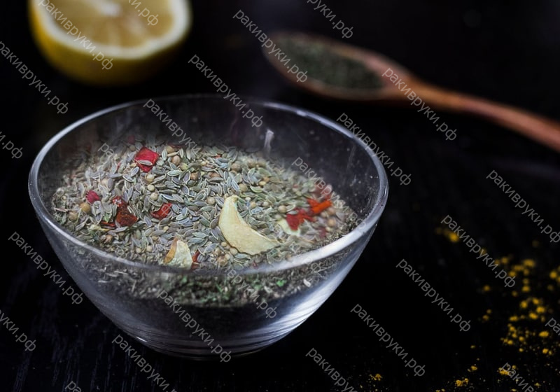 Состав: кориандр, укроп, чеснок, паприка, горчица лавровый лист, перцы (чили/душистый)